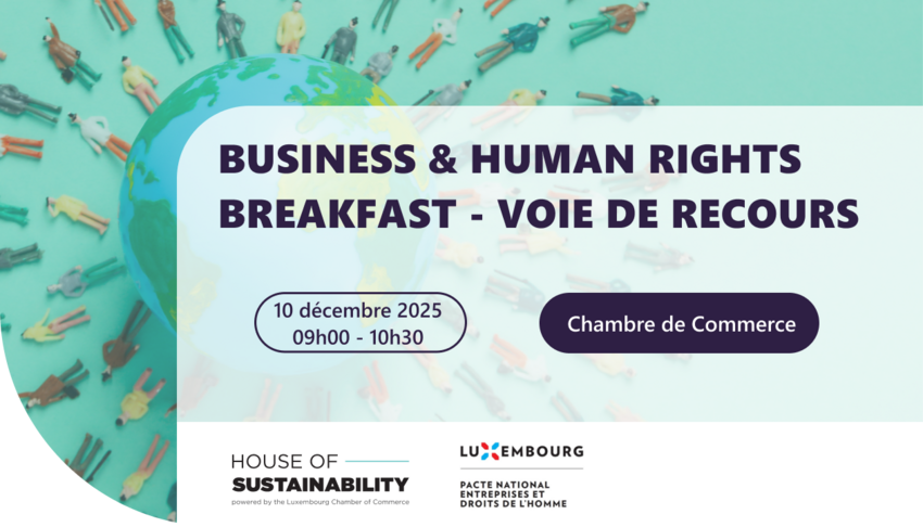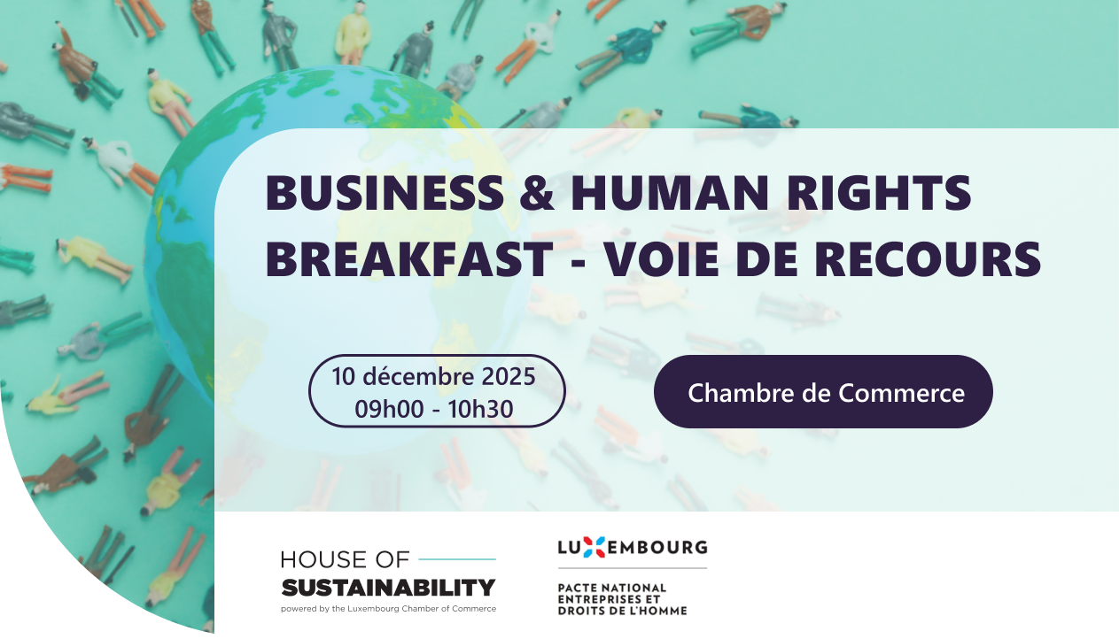 La House of Sustainability a le plaisir de vous inviter à notre prochaine éditon du Business and Human Rights Breakfast qui traitera la thématique de la « voie de recours », qui aura lieu le 10 décembre de 9h00 à 10h30 à la Chambre de Commerce.