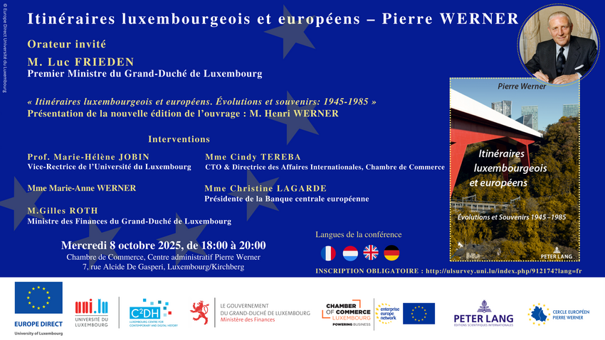 L’Europe Direct de l’Université du Luxembourg (2021-2025), l’Université du Luxembourg, le Luxembourg Centre for Contemporary and Digital History, ensemble avec leurs partenaires – le Ministère des Finances du Grand-Duché de Luxembourg, la Chambre de Commerce, Entreprise Europe Network, la Banque centrale européenne, le Cercle Européen Pierre Werner et la maison d’édition universitaire internationale P.I.E. Peter Lang – ont le plaisir de vous convier à la soirée académique Itinéraires luxembourgeois et européens – Pierre WERNER qui aura lieu le mercredi 8 octobre 2025 à 18h00 à la Chambre de Commerce.