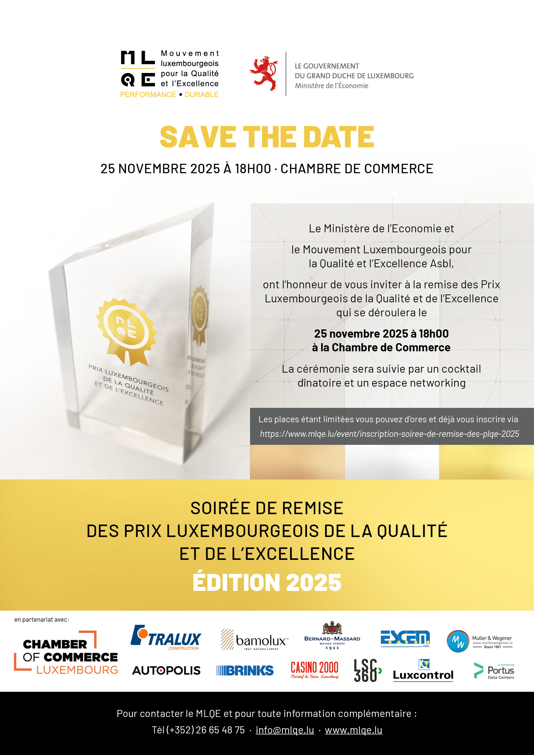 Pour son édition d’avant 25ème anniversaire, Le Mouvement Luxembourgeois pour la Qualité et l’Excellence Asbl et le Ministère de l’Economie, vous convie à la cérémonie de remise des prix Luxembourgeois de la Qualité et de l’Excellence 2025 qui se déroulera le mardi 25 novembre à 17h30 à la Chambre de Commerce (7, rue Alcide de Gasperi, L-2981 Luxembourg-Kirchberg).