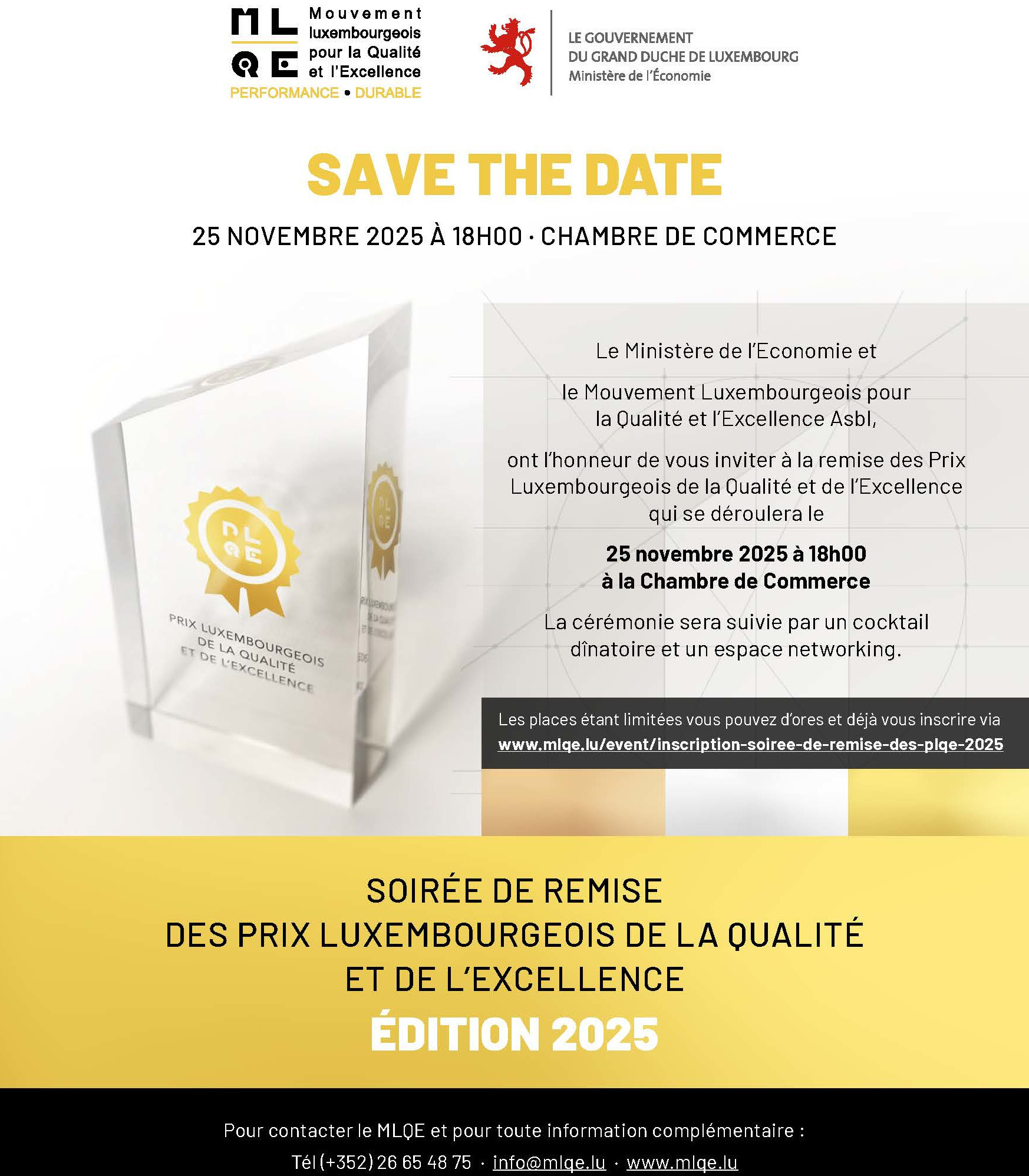 Pour son édition d’avant 25ème anniversaire, Le Mouvement Luxembourgeois pour la Qualité et l’Excellence Asbl et le Ministère de l’Economie, vous convie à la cérémonie de remise des prix Luxembourgeois de la Qualité et de l’Excellence 2025 qui se déroulera le mardi 25 novembre à 17h30 à la Chambre de Commerce (7, rue Alcide de Gasperi, L-2981 Luxembourg-Kirchberg).