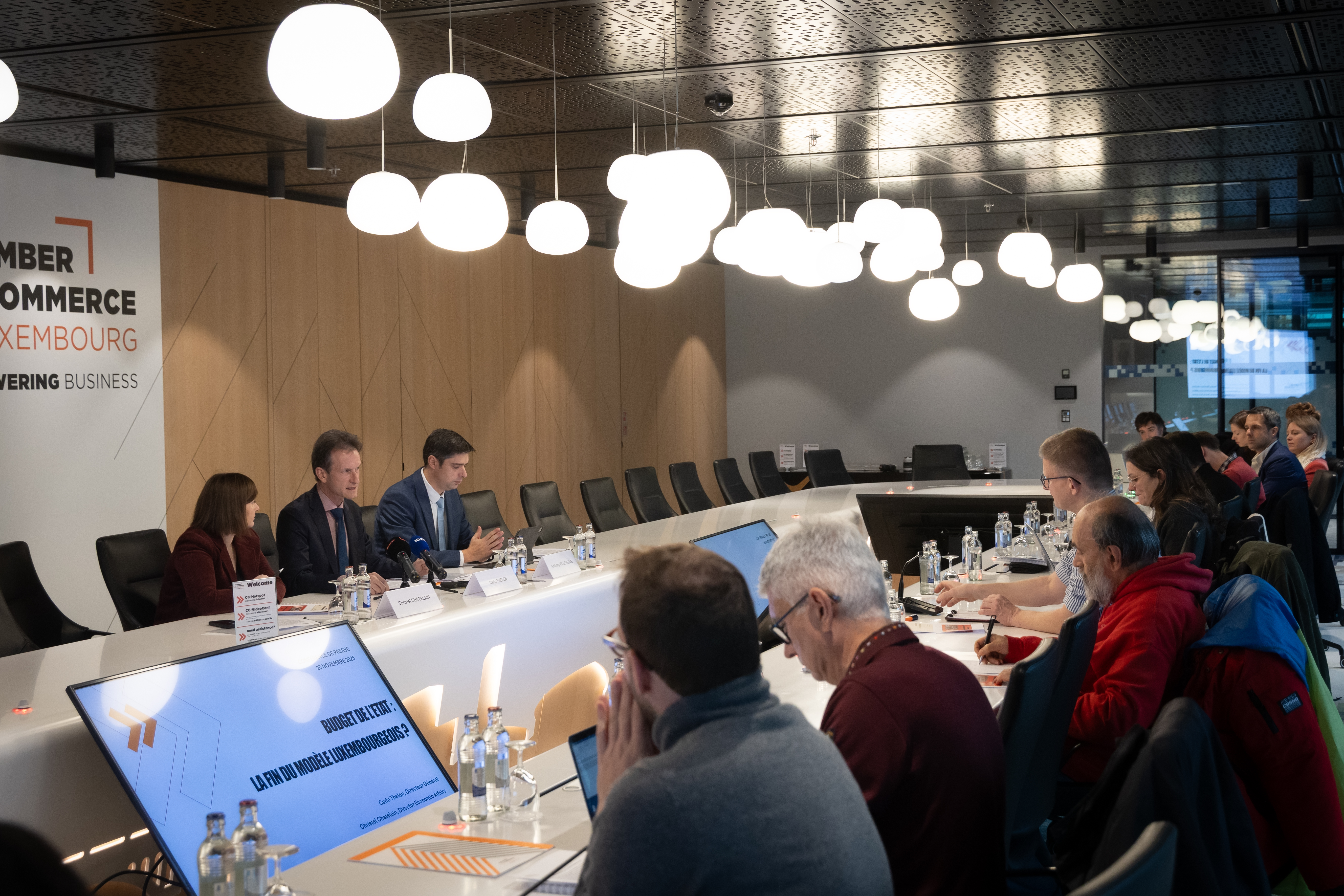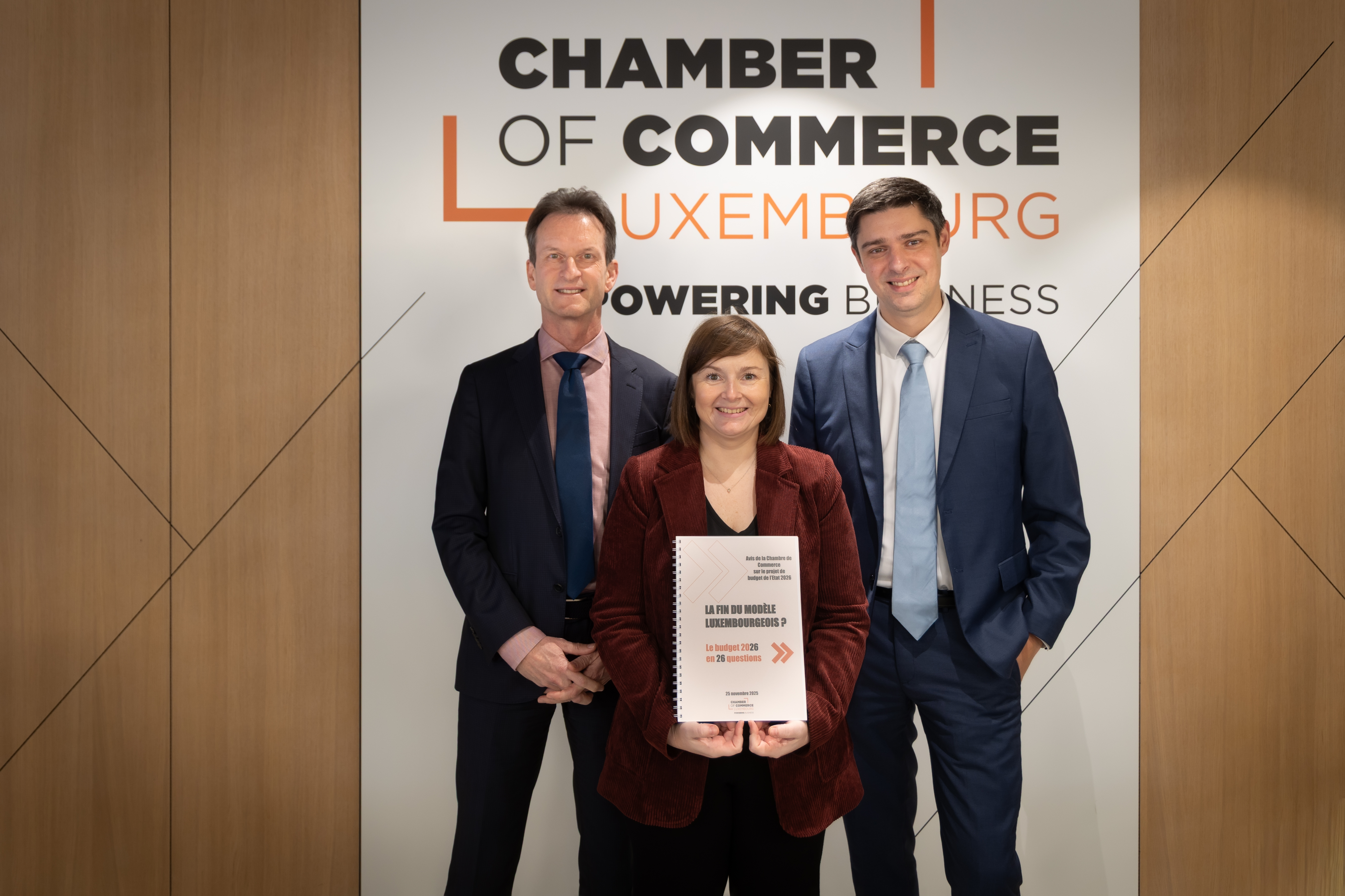 de g. à d. : Carlo Thelen, directeur général de la Chambre de Commerce, Christel Chatelain, directrice des Affaires Economiques, Anthony Villeneuve, Senior economist. ©Laurent Antonelli, Blitz
